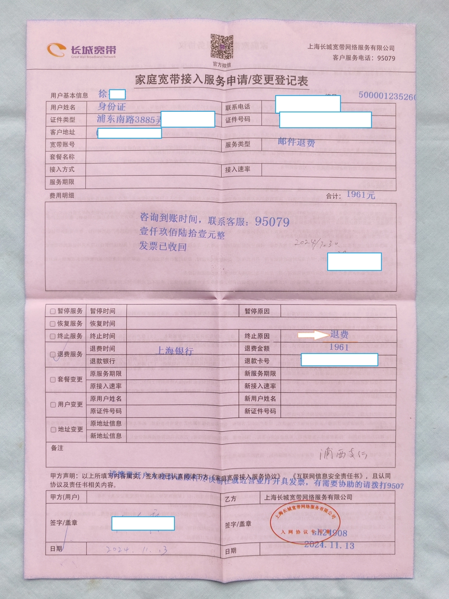 徐先生说,他是长城宽带的老用户,2024年7月,他续费2179元,长城宽带家庭宽带业绩延至2030年1月到期。之后,因小区鼓动“光纤到户修订工程”,原有廓清被替换,徐先生向长城宽带提倡解约。2024年11月,他办理隔绝业绩手续,条件退还2026年1月至2030年1月这四年的用度。经两边协商,退款金额刚烈为1961元。同期,长城宽带向销耗者出具了一张退款登记表,其上写明了具体退款数额。